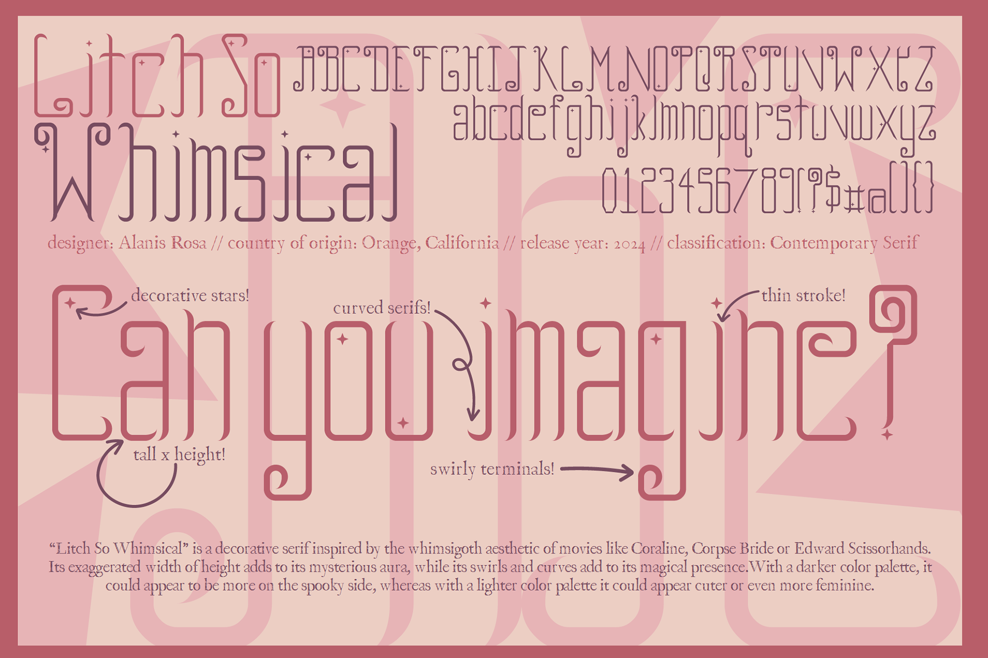 litch (so whimsical): Recently, I developed a fascination with fonts and decided it was time to create my first typeface. I wanted to create something that could be used for a title card of some eccentric stop motion film and so this one was born. The program I used (fontstruct,) was very limiting; but even with the modular restrictions, I was still able to create somewhat organic elements to these otherwise angular characters. I hope to design more fonts in the future, next time with a more hand-made and analog feel.