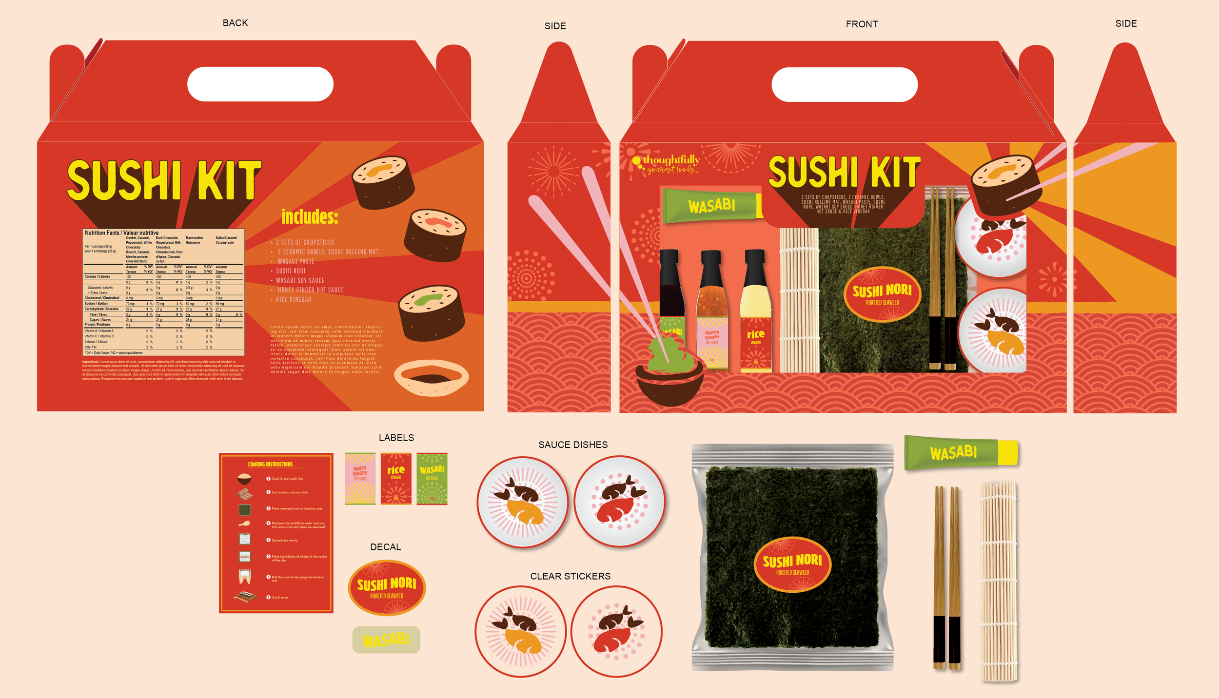 This Sushi Kit is a gift box with the essential ingredients for making DIY sushi. This Thoughtfully Modern Gourmet custom item is for Canadian chain store Winners, and they wanted a trendy design that would resonate with “foodies.” I wanted to create a bright and eye-catching design that would really stand out in the shelves.
