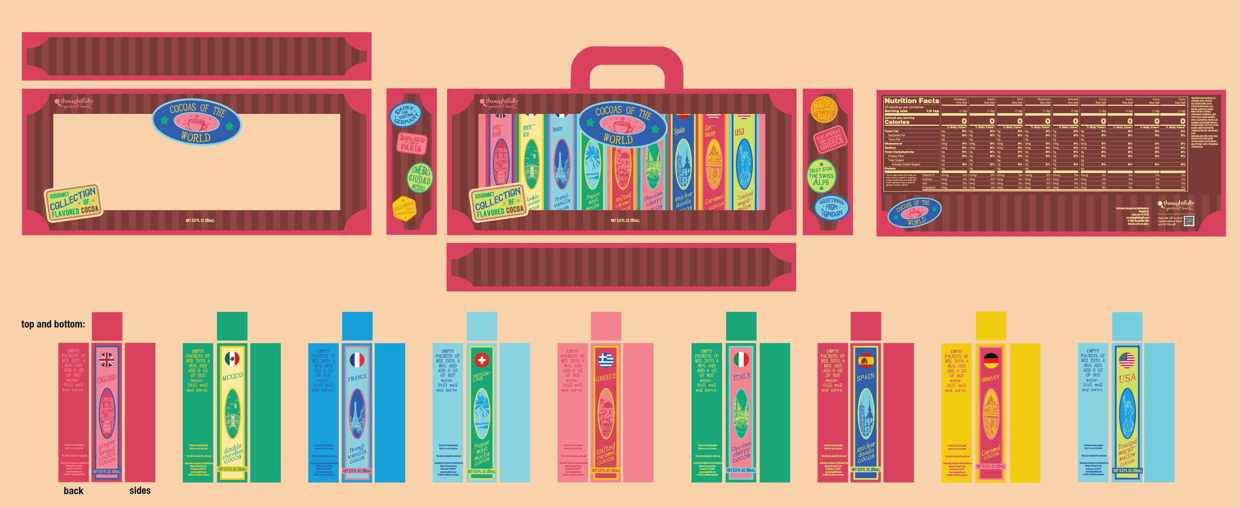 This Cocoas of the World Gift Set was a really fun project for Canadian chain store Shoppers Drug Mart. They wanted a world-themed set of different flavored hot chocolates. I wanted to design something that felt really fresh and eye-catching while still being somewhat familiar in its art direction. I was inspired by the look of vintage luggage, and designed the box to resemble a travelling case with stickers from each of the countries referenced.