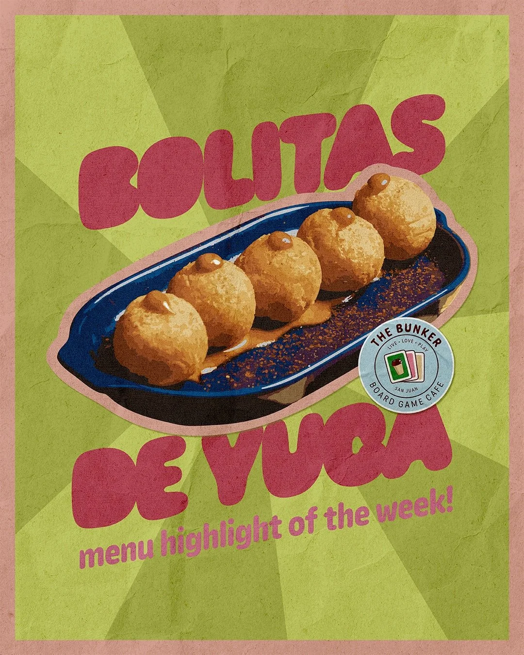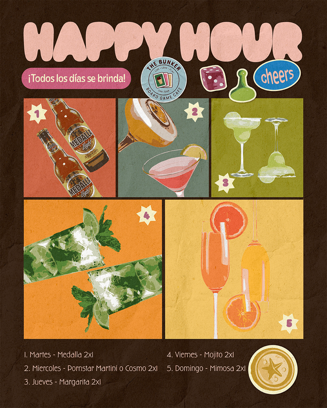 about the project: The Bunker Board Game Cafe in San Juan, Puerto Rico is a restaurant and coffee shop in which you can enjoy food and drinks with your friends, as well as play board games in the meantime. As it's the first of its kind to open in Puerto Rico (where I'm from,) I was very excited to help develop the brand and aesthetic of this new business. I designed a logo that was cute and bright, fun enough to appeal to children but simple enough to express to adults that it's also a space for them. I am also the art director and graphic designer all Bunker social media platforms, constantly creating eye-catching content. Their instagram account is at 45.5K followers currently.